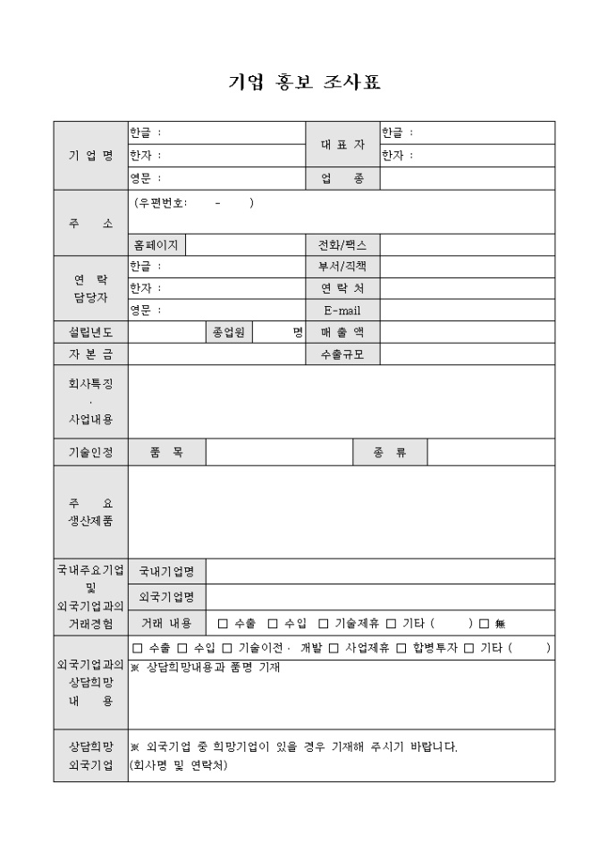 9,000원/월외국기업과의 거래를 주선하기 위해 해당 기업의 기업 현황과 사업내용 등의 사항을 조사하여 기록하고 홍보하기 위한 기업홍보조사표 양식입니다.