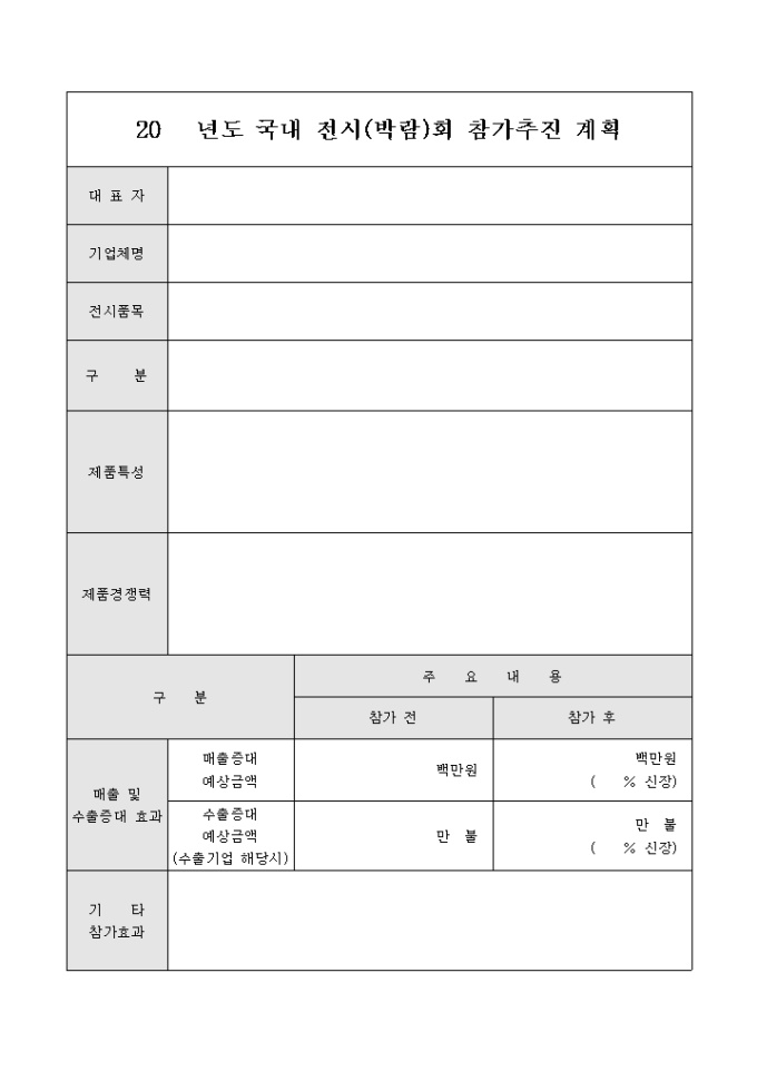 국내 전시 박람회의 참가 추진계획입니다. 참가 제품의 특징과 매출내용을 기록 할 수 있습니다.
