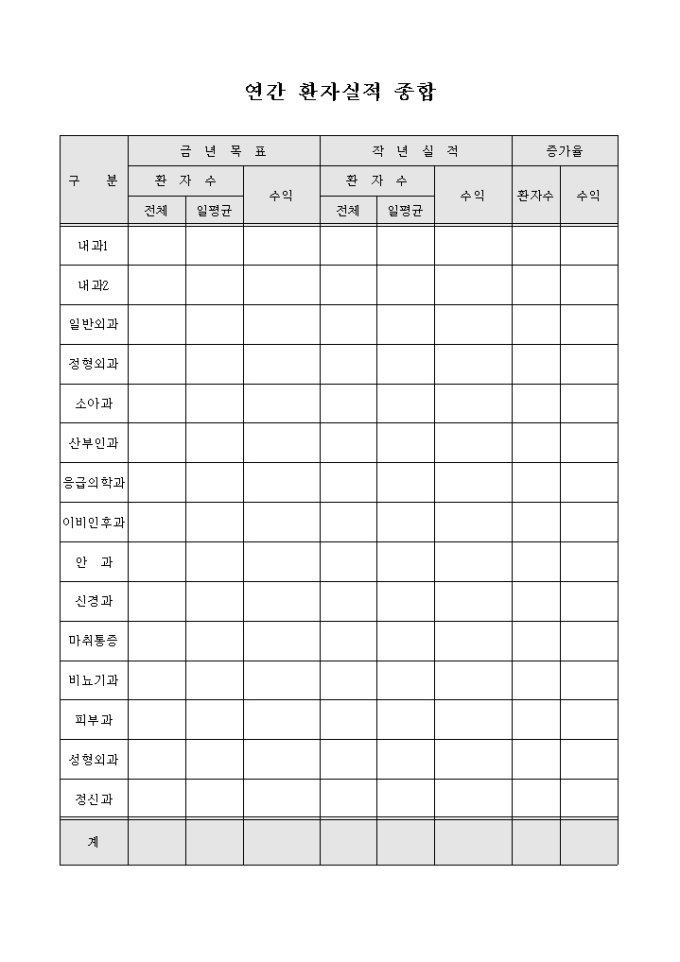 9,000원/월병원에서 연간 환자실적의 현황을 종합, 정리하여 작년과 비교할 수 있도록 제작된 서식입니다.