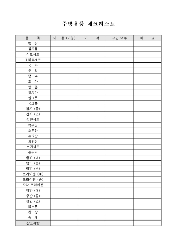 9,000원/월결혼전 신혼집에 장만할 주방용품에 대하여 각 항목별로 작성하고 구입여부를 판단하기 위한 주방용품 체크리스트 양식입니다.