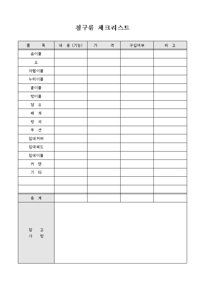 침구류체크리스트(혼수용품)