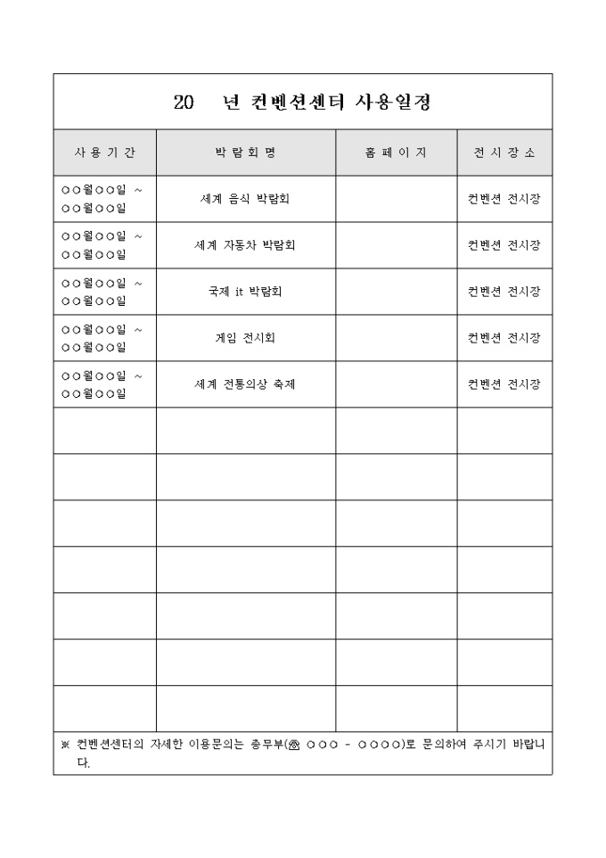 9,000원/월컨벤션센터 사용일정입니다. 일정별 실시되는 박람회를 확인 할 수 있습니다.