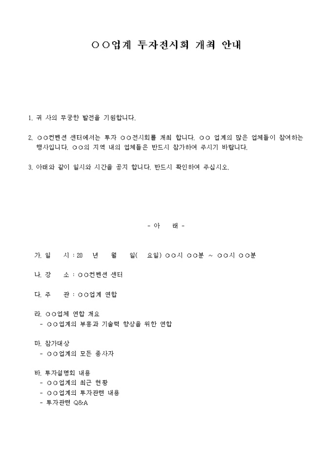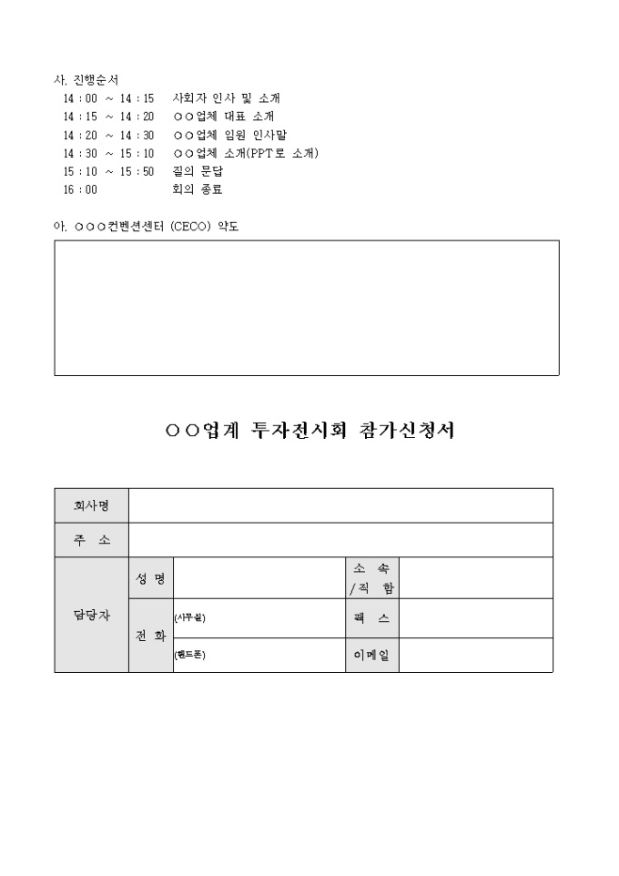 투자전시회에 개최에 대한 안내문 입니다. 신청서와 내용등이 포함되어 있습니다.