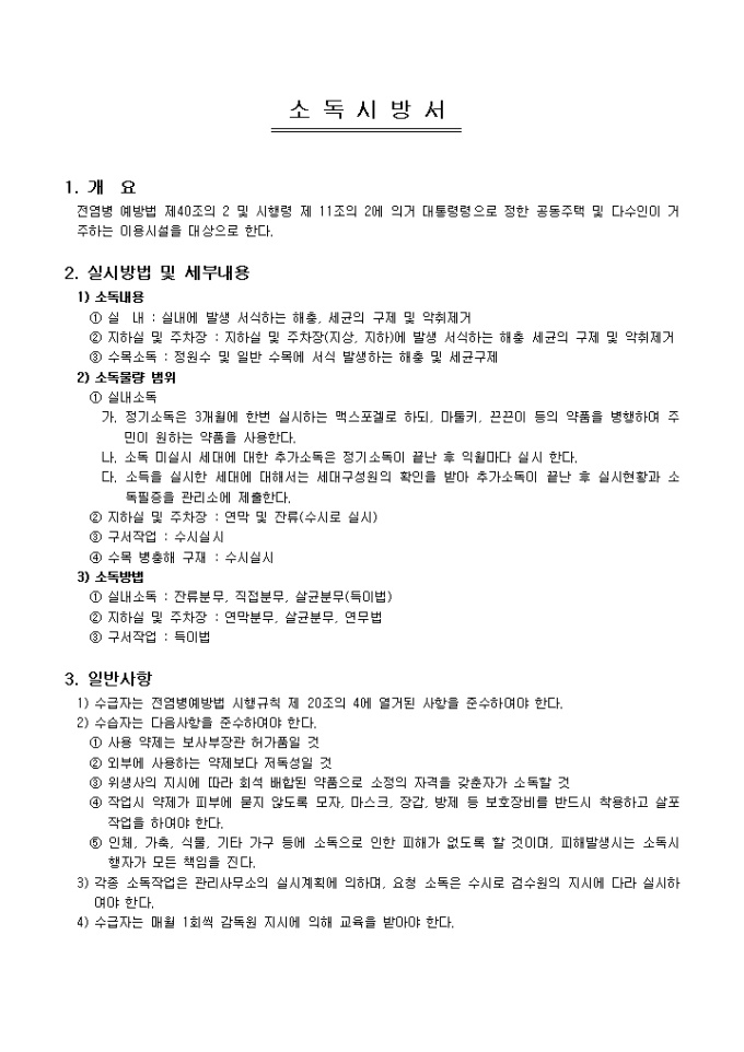 공동주택 및 다수인이 거주하는 이용시설을 대상으로 작성된 소독시방서입니다. 개요, 실시방법 및 세부내용, 일반사항 등의 항목으로 구성되어있습니다.