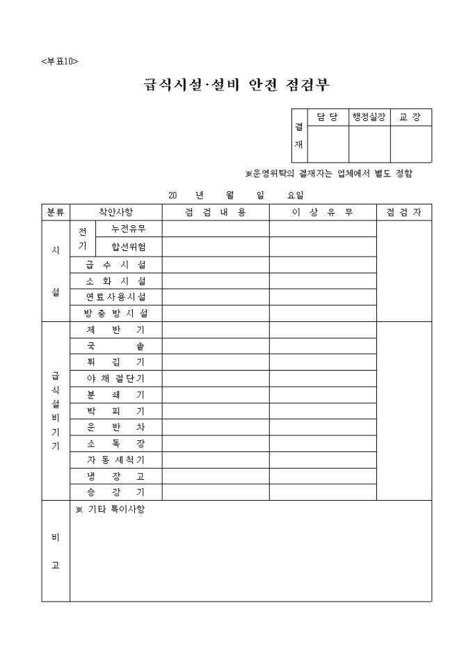 급식시설, 설비안전점검부