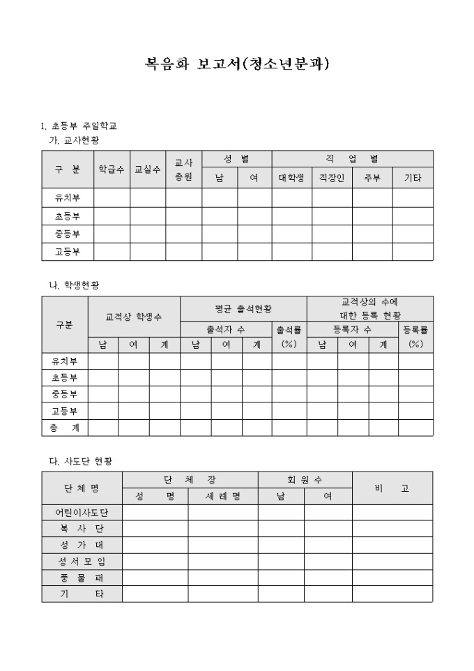 교회에서 년간 복음화 사업에 대한 보고서를 작성할 때 사용하는 서식으로써 청소년분과파트에서 사용할 수 있도록 제작되었습니다.