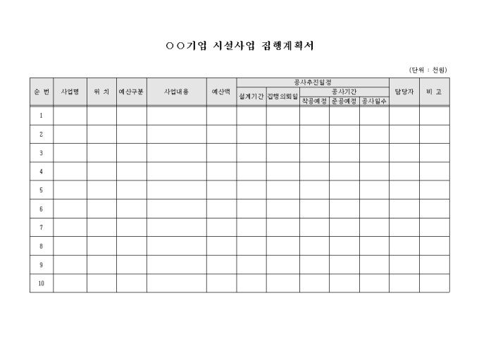 9,000원/월기업에서 진행하는 시설사업에 대하여 사업별로 집행 계획 내용을 작성할 수 있도록 구성된 시설사업 집행계획서 양식입니다. 사업명과 위치, 사업내용, 예산액, 공사추진일정 등의 항목을 기재할 수 있습니다.