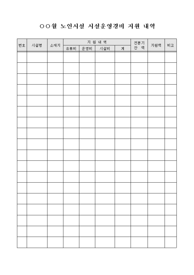 9,000원/월노인시설에 지원되는 시설운영경비의 내역을 기록할 수 있도록 구성된 양식으로 해당 시설명과 소재지, 지원내역, 전분기 잔액, 지원액 등의 내용을 기재할 수 있습니다.