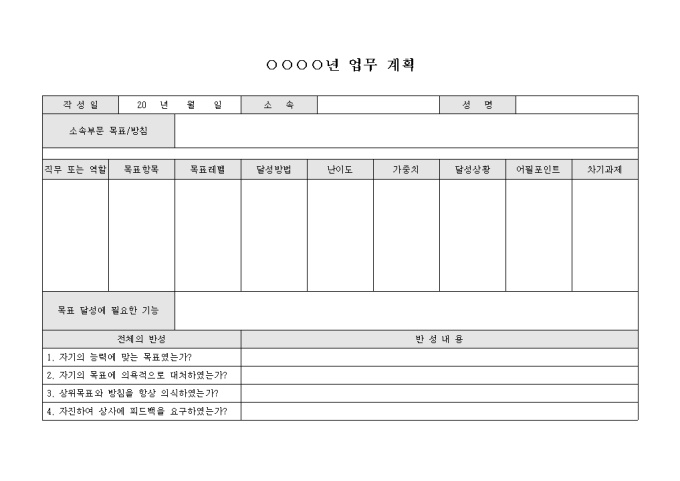 연간의 업무계획에 대하여 그 내용을 기재하는 업무계획 양식으로 소속 부문의 목표/방침에 따라 개인의 직무 역할, 목표, 달성방법, 달성상황 등의 내용을 기재하고 계획의 실천에 대한 반성 내용을 기재할 수 있도록 구성되어 있습니다.