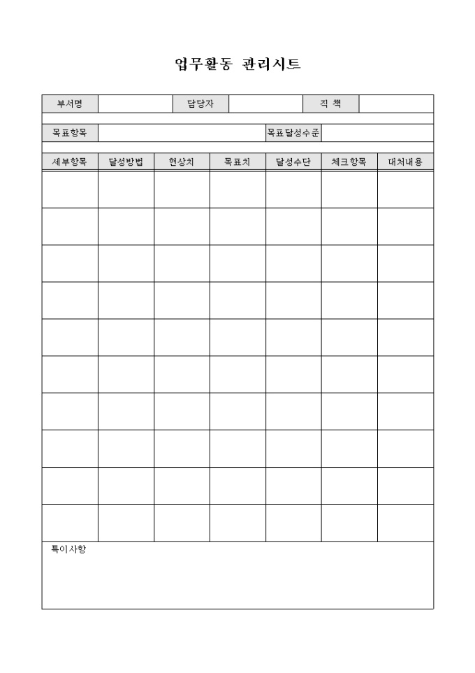 업무 활동에 대한 목표를 세우고 해당 목표에 대한 세부항목 및 달성방법, 현상치, 목표치, 달성수단, 대처내용 등의 내용을 기록하여 업무활동을 관리 하기 위한 업무활동 관리시트 양식입니다.