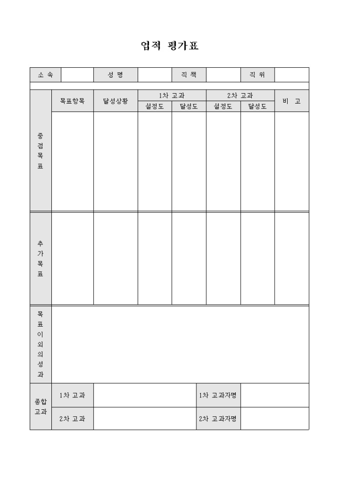 회사에서 진행하고 있는 업무에 대한 업적을 평가하기 위해 기록하는 업적 평가표 양식으로 업무의 중점목표와 추가 목표를 세우고 그 목표에 대한 달성상황 등을 통해 업적을 평가할 수 있도록 구성되어 있습니다.