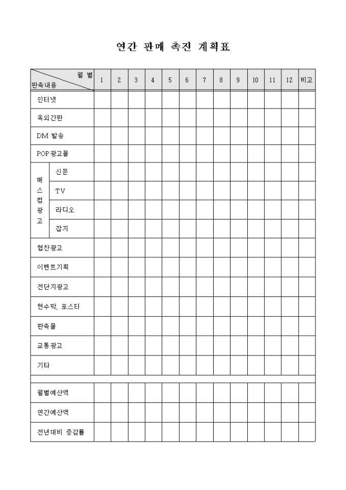 9,000원/월제품의 판매를 촉진하기 위해 연간 판촉 내용을 계획하는 계획표 양식으로 월별로 각 판촉 내용별로 일정을 체크할 수 있도록 구성되어 있습니다.