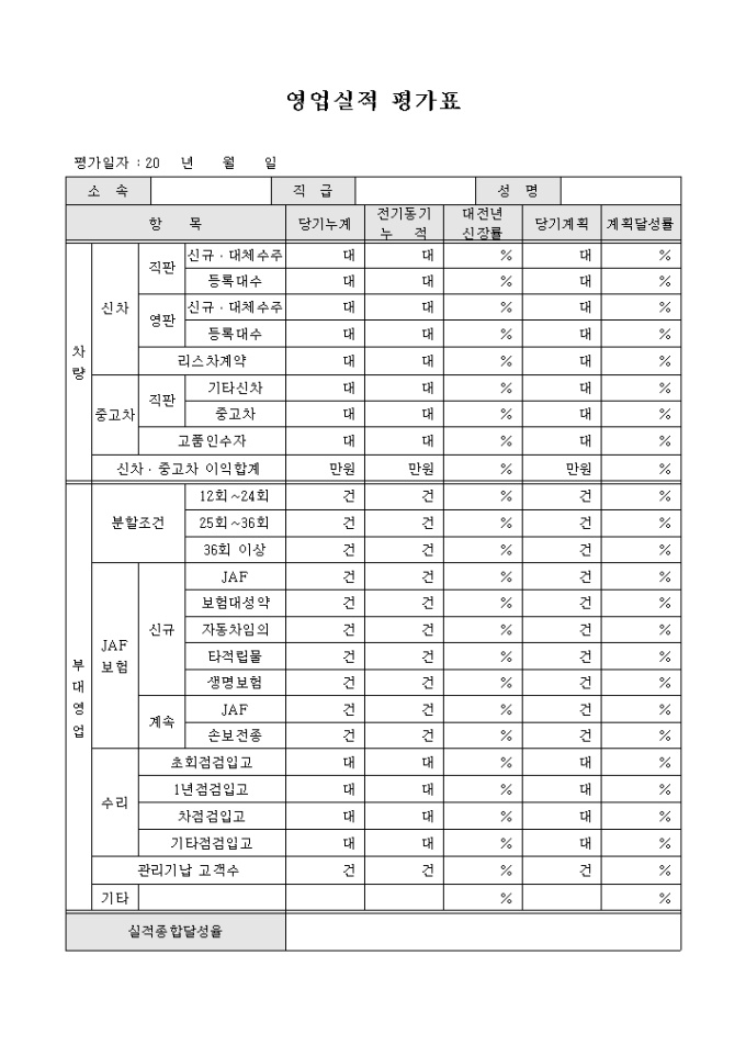 자동차회사에서 근무하고 있는 영업직 직원에 대하여 실적을 평가하기 위한 실적 평가표 양식으로 차량 판매 및 부대영업 등의 업무 실적을 기록할 수 있도록 구성되어 있습니다.
