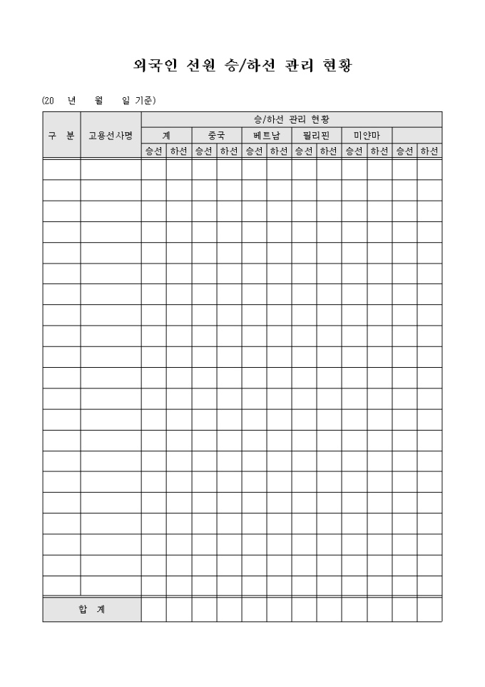 외국인 선원의 승·하선 현황을 관리하기 위해 작성하는 양식으로 외국인 선원을 고용한 선사명과 외국인 선원의 국적별로 승선 및 하선 현황을 기재할 수 있습니다.