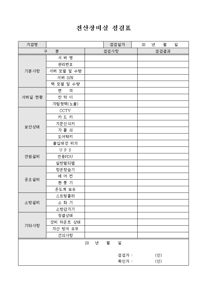 9,000원/월기업의 전산장비실에 대한 점검을 하기 위해 작성하는 점검표 양식으로 기본사항 및 서버실 현황, 보안상태, 전원설비, 공조설비, 소방설비 등에 대한 점검사항 및 점검결과를 기재할 수 있습니다.