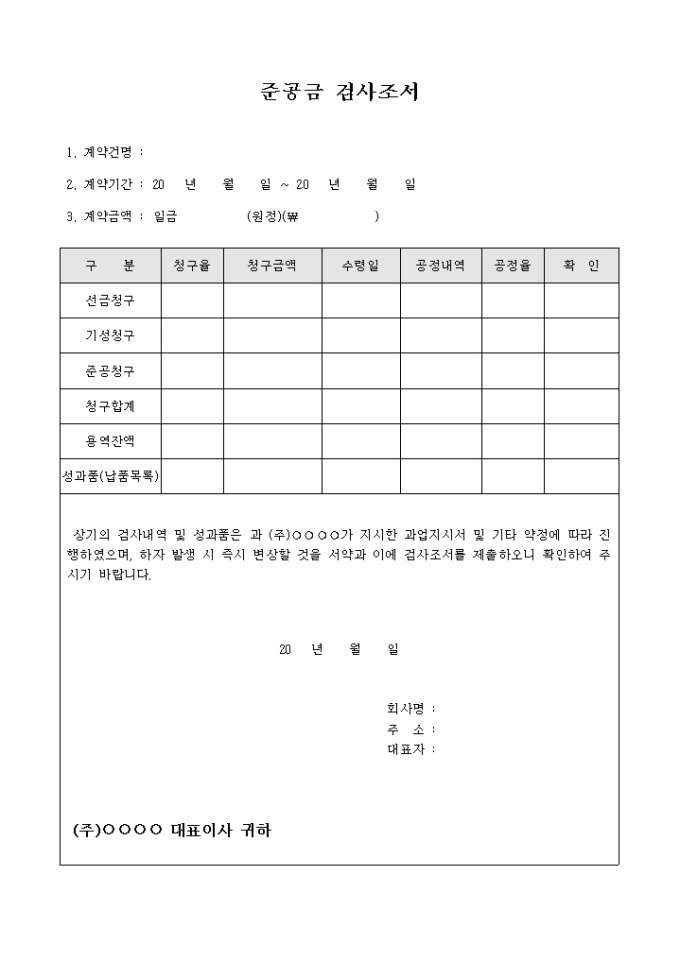 9,000원/월사업의 진행 상황별로 청구금액 및 수령일, 공정내역, 공정율 등의 사항을 기재하고 제출하는 준공금 검사조서 양식입니다.