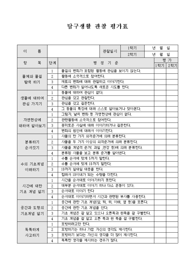 9,000원/월유치원에서 어린이에 대한 탐구생활을 관찰하고 평가 할 수 있도록 제작된 서식입니다.