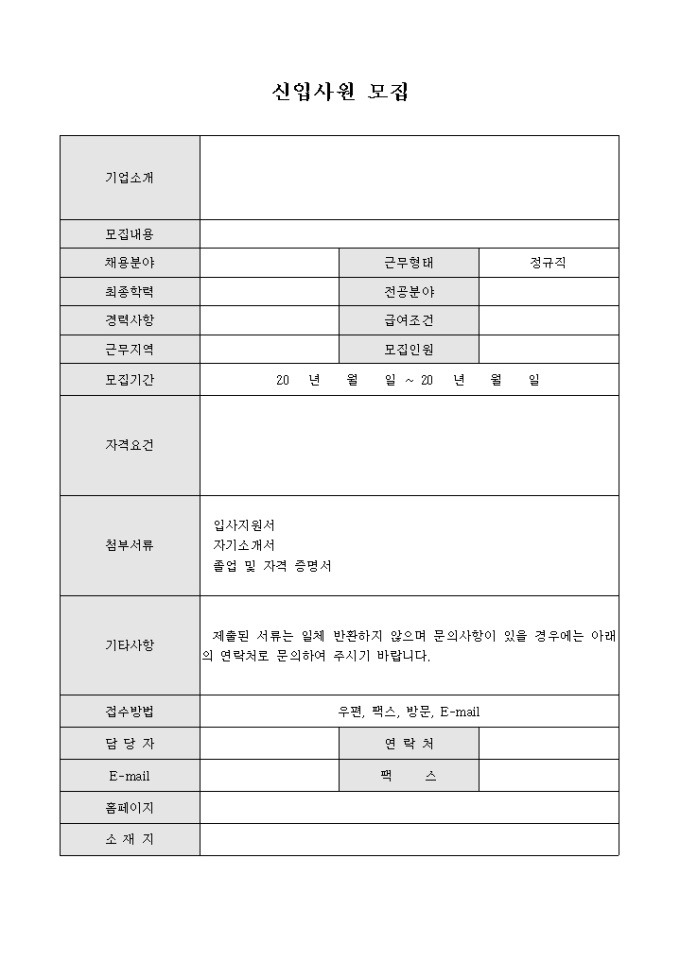 기업에서 신입사원을 모집하고자 할 때 사람들에게 알릴 수 있도록 만들어졌으며 제출서류 및 자격조건 등의 항목을 기재할 수 있게끔 제작된 서식입니다.