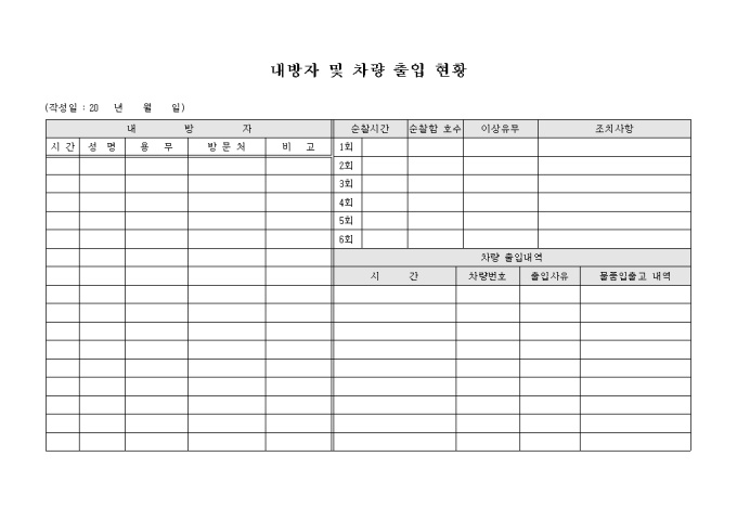 9,000원/월회사에 내방한 인원 및 차량 출입의 현황을 기록하는 내방자 및 차량 출입 현황 양식으로 내방자의 출입시간, 성명, 용무, 방문처, 차량의 출입시간, 차량번호, 출입사유 등의 내용을 기재할 수 있습니다.
