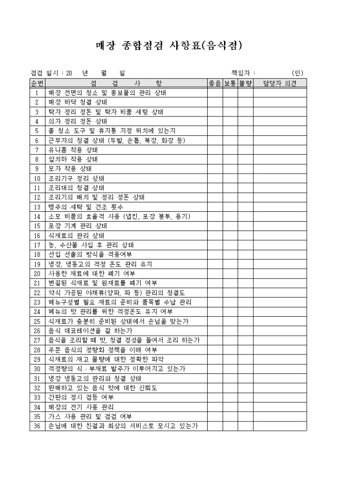 음식점 매장에 대하여 종합적으로 점검 및 관리 하기 위한 종합점검 사항표 양식으로 점검사항에 대하여 좋고 나쁨을 평가하고 담당자의 의견을 기재할 수 있도록 구성되어 있습니다.