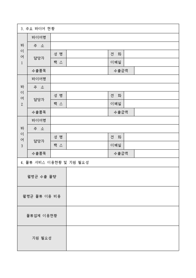 9,000원/월해외수출을 위한 제품의 개요 및 마케팅 현황, 현재의 수출실적, 거래하고 있는 주요 바이어 현황, 물류 서비스 지원현황 등의 내용을 기재할 수 있는 해외 수출 및 물류 이용 현황 서식입니다.