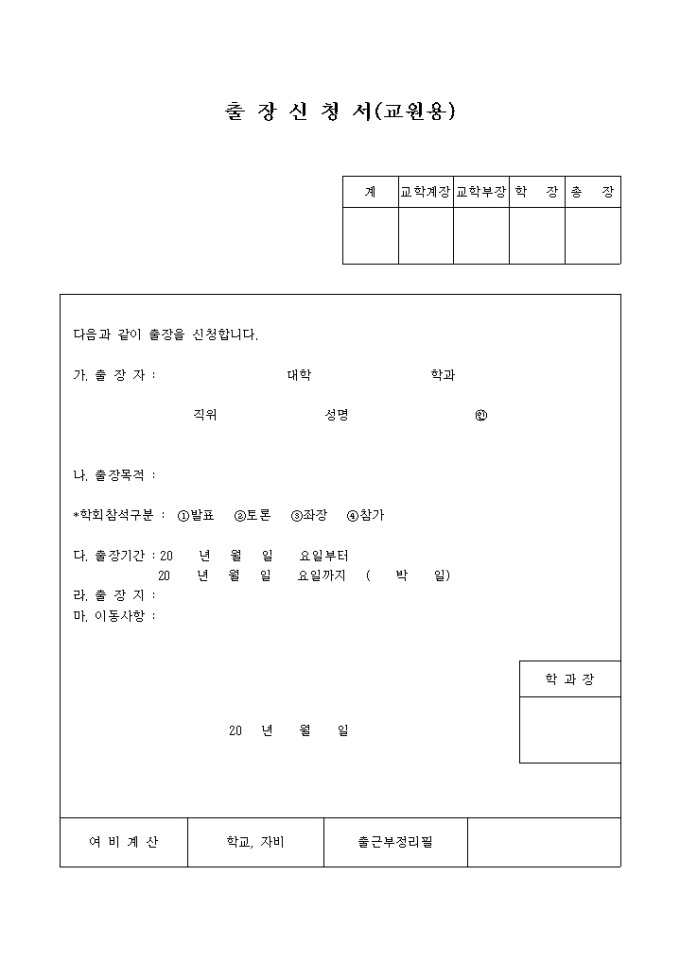 9,000원/월출장자,출장목적,출장기간,출장지,이동사항 등을 기재하는 출장신청서(교원용)입니다.