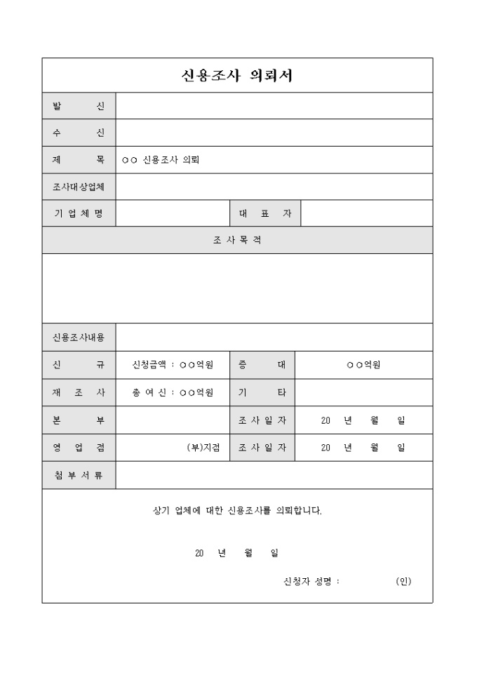 업체에 대한 신용조사를 의뢰하고자 할 때 사용하는 신용조사 의뢰서 입니다.