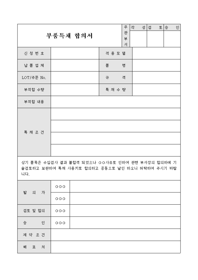 수입검사시 불합격된 물건에 대해 합의하에 특채 사용하겠다는 내용의 합의서 입니다.
