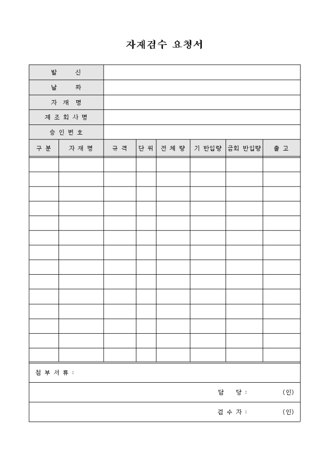 9,000원/월건설현장에 반입되는 자재들에 대하여 검수를 요청하는 내용의 자재검수 요청서 양식입니다.