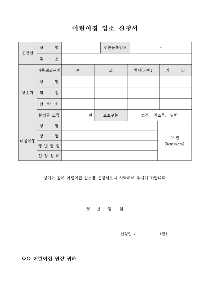 9,000원/월어린이집 입소를 희망하여 이에 대하여 어린이집에 제출하고자 할 때 사용할 수 있도록 만들어졌으며 보호자 인적사항, 원아 인적사항 등을 기재할 수 있게끔 제작된 서식입니다.