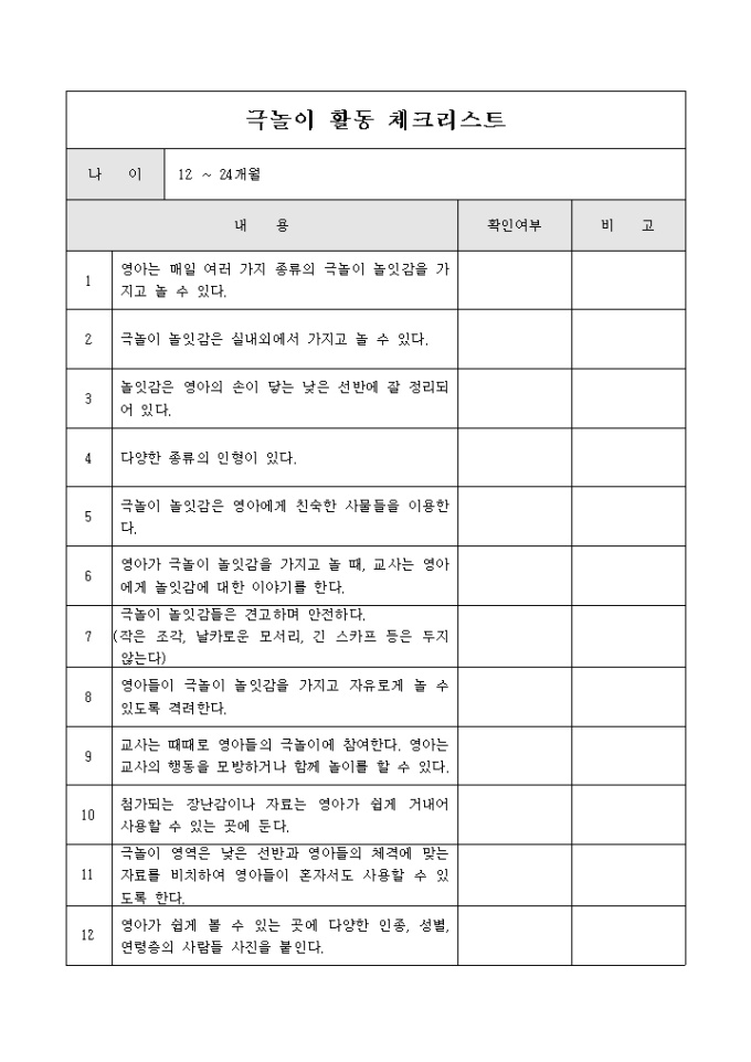 9,000원/월12개월 이상 24개월 미만의 아동의 극놀이활동에 대한 교육시 사용하는 체크 리스트 입니다. 교육시 주의할점등이 기록되어 있습니다.
