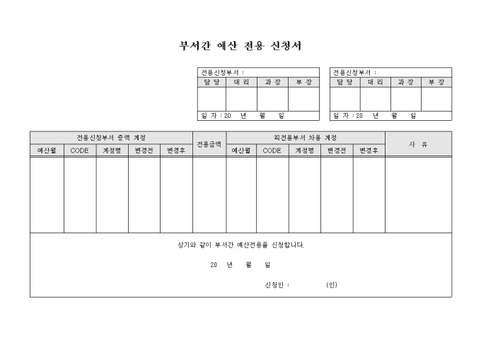 9,000원/월부서간에 예산의 증액 및 차용의 허가를 구하는 부서간 예산 전용 신청서 양식입니다. 예산이 부족한 부서과 예산에 여유가 있는 부서에게 예산을 차용하고자 할 때 작성할 수 있습니다.