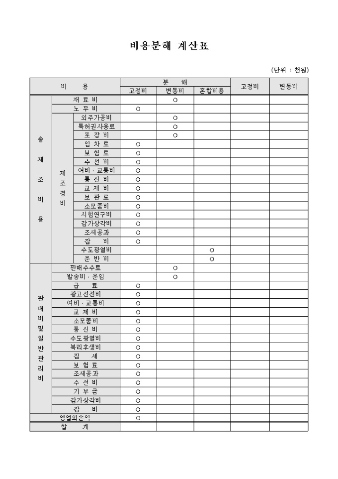 9,000원/월기업을 운영하는데 소요되는 비용에 대하여 고정비, 변동비, 혼합비로 구분하여 계산하기 위해 작성하는 비용분해 계산표 양식입니다.