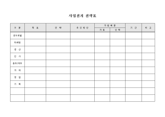 사업을 전개하기 위해 각 부서별로 목표를 세우고 목표의 달성을 위한 전략 및 추진방안, 자원배분, 목표달성 기간 등의 내용을 기재할 수 있도록 구성된 사업전개 전략표 양식입니다.