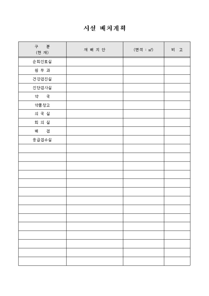 병원에서 현재 사용하고 있는 곳에서 변경이 필요하거나 신설해야 할 시설실이 필요할 경우 그에 대한 현황을 기재할 수 있게끔 제작된 서식입니다.