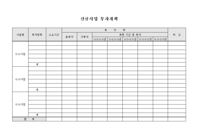 9,000원/월신규사업에 대하여 투자를 하고자 사업별로 투자항목에 대한 소요시간, 총투자액, 가투자액, 연도별 투자액 등의 투자계획을 기재할 수 있도록 구성된 신규사업 투자계획 양식입니다.