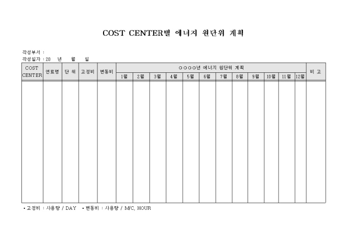 9,000원/월COST CENTER(비용부서)별 사용하는 에너지에 대해서 연간 원단위 계획을 작성하는 COST CENTER별 에너지 원단위 계획 양식입니다. COST CENTER명과 연료명, 단위, 고정비, 변동비, 월별 에너지 원단위 계획 등의 항목을 작성할 수 있습니다.