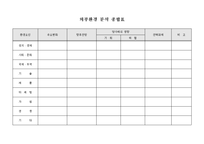 기업을 둘러싸고 있는 외부환경에 대하여 조사 및 분석 내용을 기록하는 외부환경 분석 종합표 양식입니다. 각 환경요인별로 주요변화, 향후전망, 당사에의 영향, 환경요인에 대한 전략과제 등의 항목을 기재할 수 있습니다.