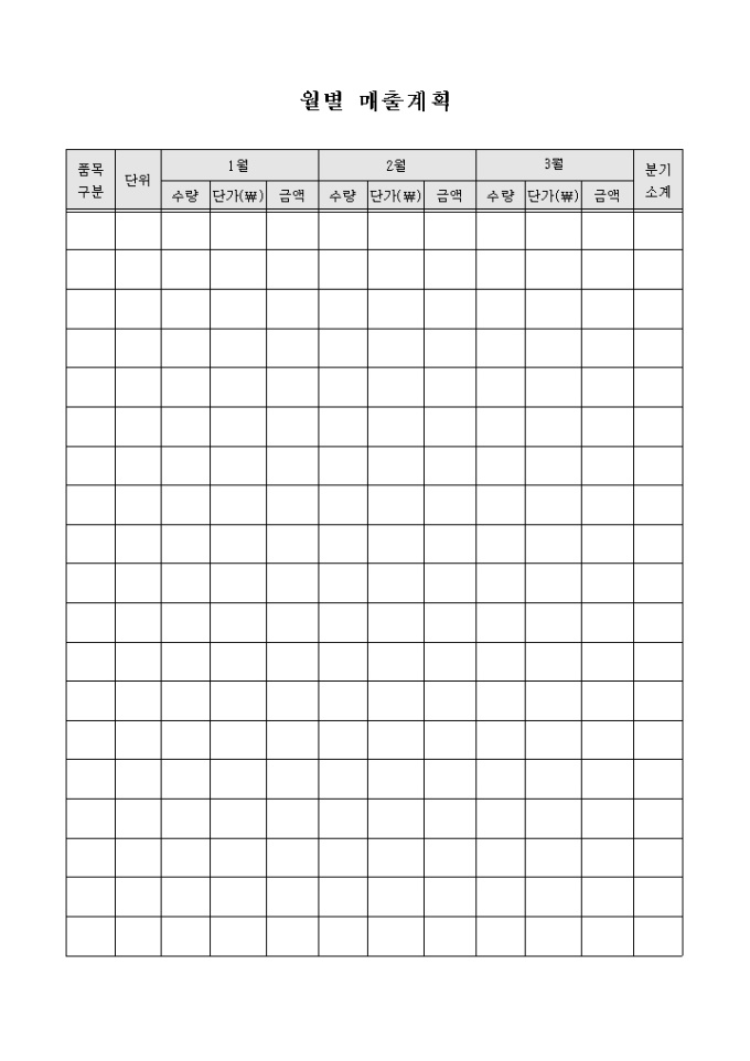 품목별로 월별 매출계획을 작성 할 수 있도록 구성된 매출계획 양식입니다. 월별로 판매 품목에 대한 수량, 단가, 금액을 기재할 수 있습니다.