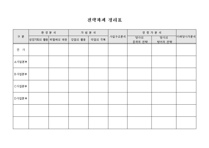 기업 전체 및 각 사업부별로 경영전략을 달성하기 위한 과제를 정리하여 작성할 수 있도록 구성된 전략과제 정리표 양식입니다. 환경, 자원, 사업구조, 경쟁자, 이해당사자 등에 대한 분석 및 실행전략과제를 기재할 수 있습니다.
