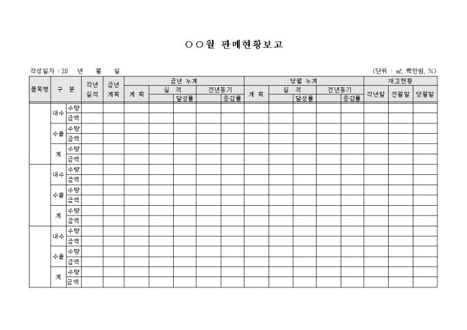 회사의 월간 판매현황을 보고하기 위해 작성하는 판매현환보고 양식입니다. 판매하는 제품의 품목별로 내수 및 수출 수량/금액에 대한 작년 실적, 금년 계획, 금년 누계, 당월 누계, 재고현황 등의 항목을 작성할 수 있습니다.