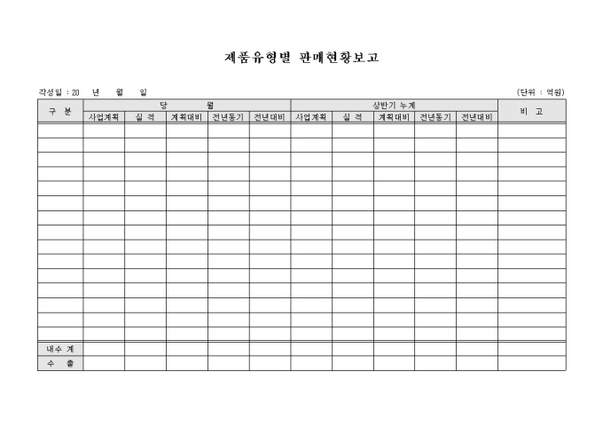 회사에서 판매하는 제품의 유형별로 판매현황을 파악하여 보고하기 위해 작성하는 판매현황보고 양식입니다. 제품별로 해당월의 사업계획, 실적, 계획대비, 전년동기, 전년대비 및 상반기의 사업계획, 실적, 계획대비, 전년동기, 전년대비 등의 항목을 작성할 수 있습니다.