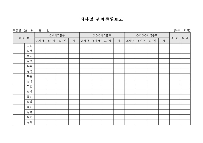 9,000원/월회사의 지사별로 제품의 판매현황을 파악하여 보고하기 위해 작성하는 판매현황보고 양식입니다. 각 지역의 지사별 제품의 판매 목표 및 실적을 기재할 수 있도록 구성되어 있습니다.