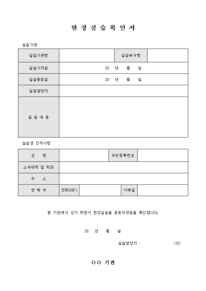 기관에서 학생이 현장실습을 종료한 후 현장실습을 수행하였다는 확인을 증명할 수 있도록 제작된 서식입니다.