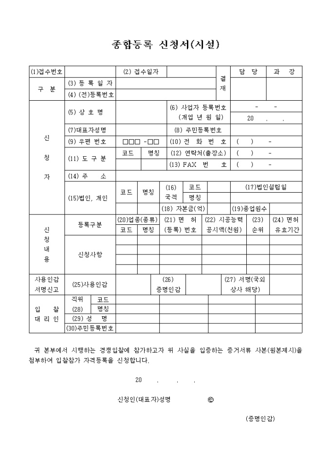 종합등록신청서 양식입니다. 귀 본부에서 시행하는 경쟁입찰에 참가하고자 위 사실을 입증하는 증거서류 사본(원본제시)을 첨부하여 입찰참가 자격등록을 신청합니다. , , ,