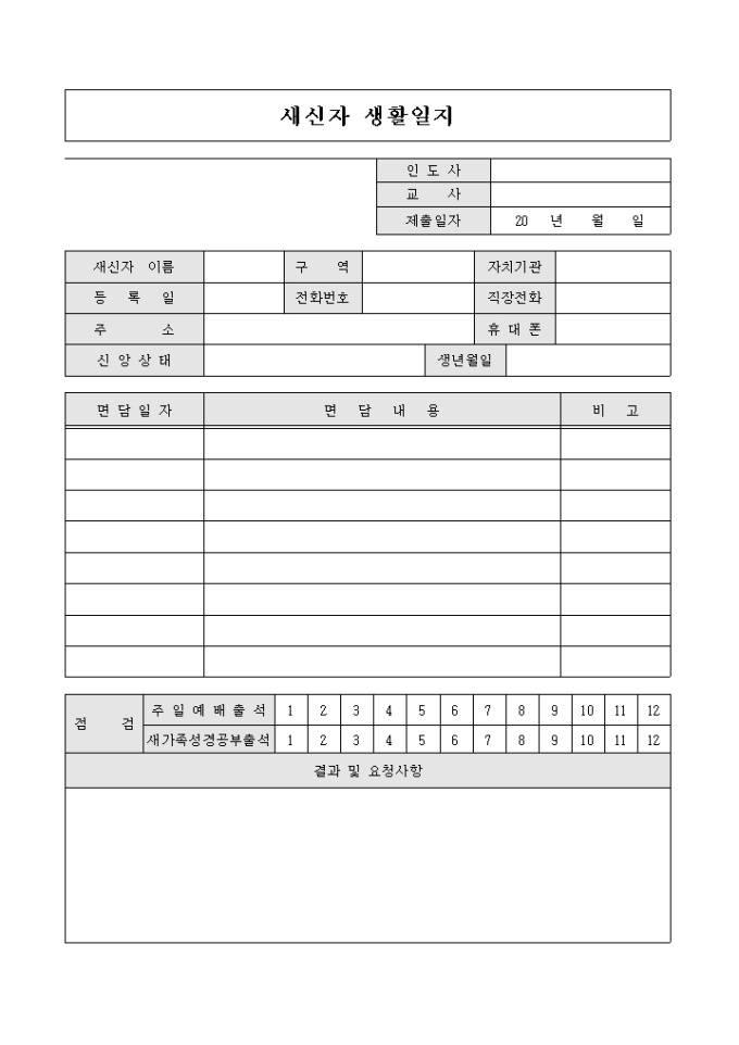 교회에서 신자가 새로이 왔을 경우 생활과 관련된 각종 사항 및 면담 내용 등을 기재하여 효율적인 관리가 이뤄질 수 있도록 제작된 서식입니다.