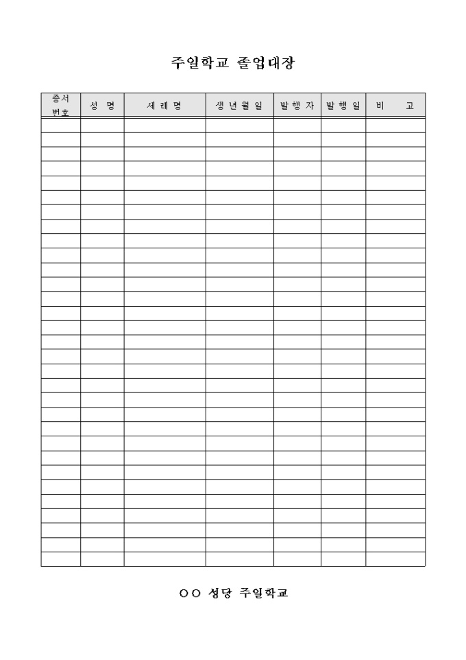 9,000원/월성당 주관인 주일학교에 졸업한 인원의 현황을 관리하기 위해 만들어졌으며 세례명, 발행일자 등을 기입할 수 있게끔 제작된 서식입니다.