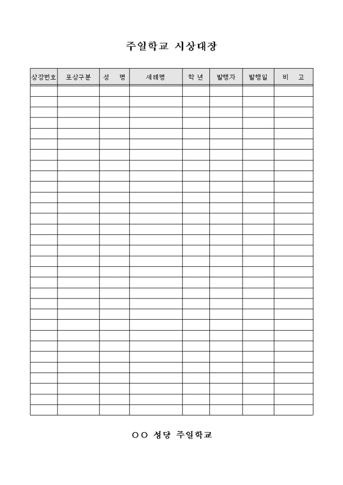 성당 주관인 주일학교에 시상현황을 체계적으로 관리하고자 만들어졌으며 포상구분, 발행일 등을 기입할 수 있게끔 제작된 서식입니다.