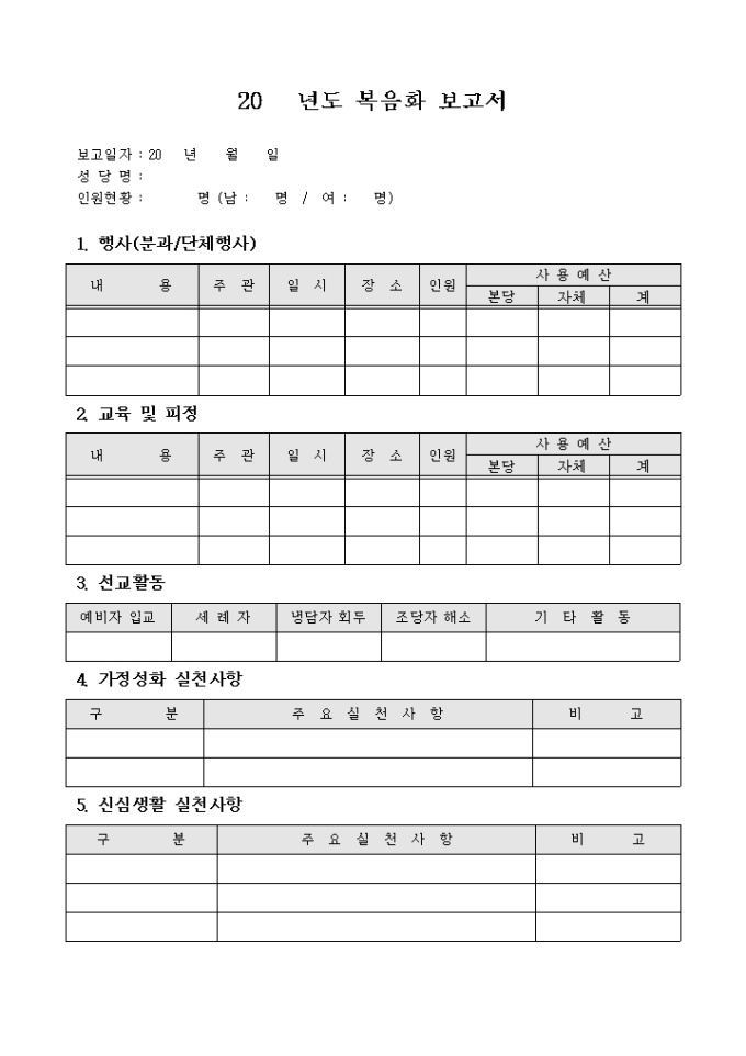 성당에서 실시한 복음화와 관련한 종합적인 사항을 보고하고자 할 때 사용할 수 있도록 제작된 서식입니다.