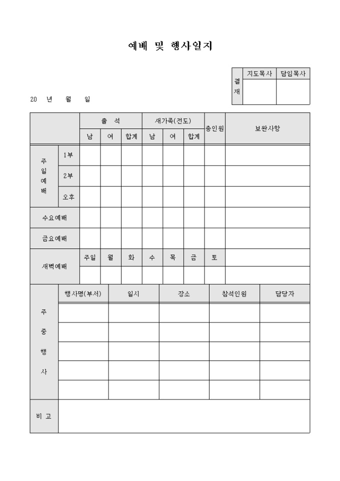 9,000원/월교회에서 진행하는 예배 및 행사 내역을 기록하기 위한 예배 및 행사일지 양식입니다. 예배의 참석인원 및 새가족, 보완사항과 주요 행사의 행사명, 일시, 장소, 참석인원 등의 내용을 기재할 수 있습니다.